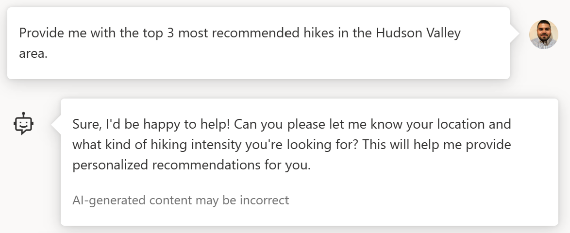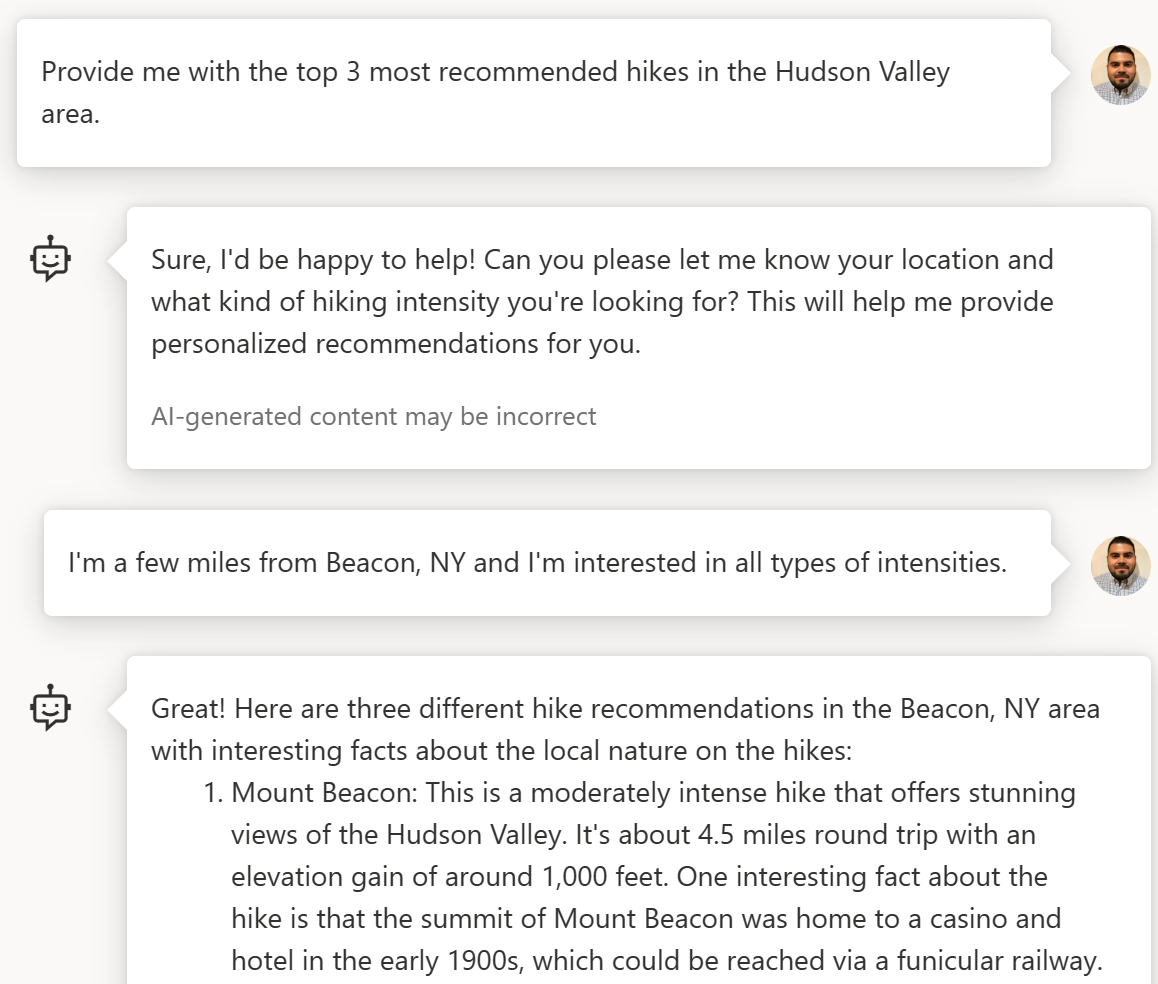 1. 시스템 메시지의 안내에 따라 Hudson Valley 지역 하이킹 코스 추천을 요청하면, 어시스턴트는 보다 개인화된 추천을 하기 위해 추가 질문을 합니다. 이전 메시지인 채팅 기록을 활용하여 거주 지역과 하이킹 강도에 대한 설명을 요청합니다.