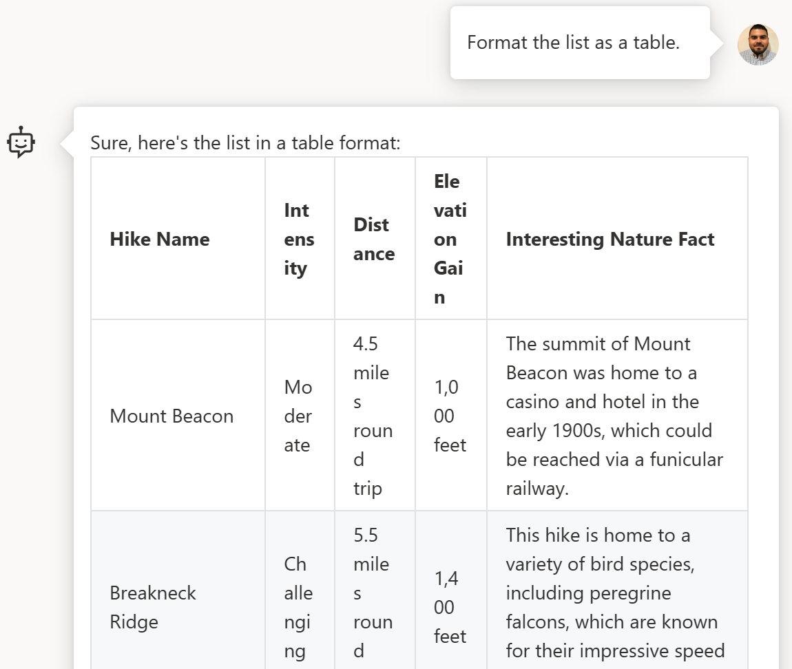2. 채팅 기록에는 최초 추천 목록이 포함되어 있습니다. 목록을 표 형태로 만들어 달라고 요청하면 어시스턴트는 표를 작성하는 데 필요한 정보를 얻기 위해 채팅 기록의 이전 메시지를 활용합니다.